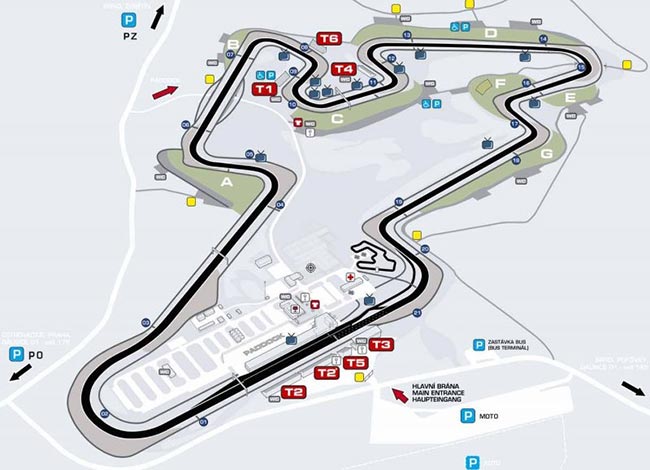 MOTODROM BRÜNN Strecke: Länge: 5403m; Rechtskurven: 8; Linkskurven: 6; Streckenbreite: 15m